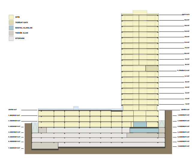 | VENTILATION SYSTEM | The infrastructure of the office floors will be prepared fresh air and exhaust systems for each individual office, the heat recovery unit type will be made by the central ventilation air handling units. 10 m² / person admission and 50 m³ / h fresh air will be provided. Office floors will be made central air conditioning in wet areas. In the parking floors normal ventilation and smoke exhaust system will be implemented as fan'l jet system. Smoke evacuation system on all floors, fire escapes and emergency elevator pressurization will be applied. |